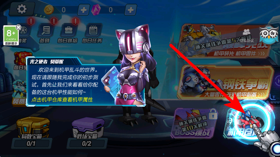 1、進入游戲后,先點擊機甲倉庫,能查看機甲屬性,像迅影刺殺者的耐久度、攻擊力等關鍵戰(zhàn)斗數值都清晰呈現,幫助了解機甲基礎戰(zhàn)力。