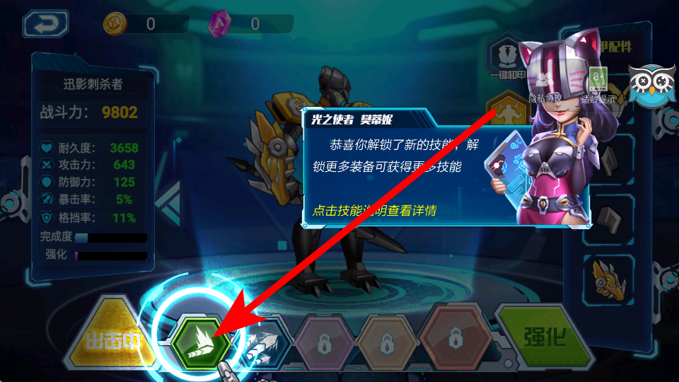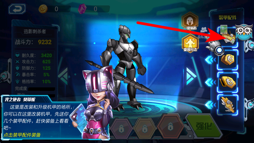 2、在改裝升級場所,可點擊裝甲配件進行裝備,裝備后機甲的各項屬性會得到提升,比如迅影刺殺者裝備配件后,耐久度、攻擊力等會增加,讓機甲更強大。