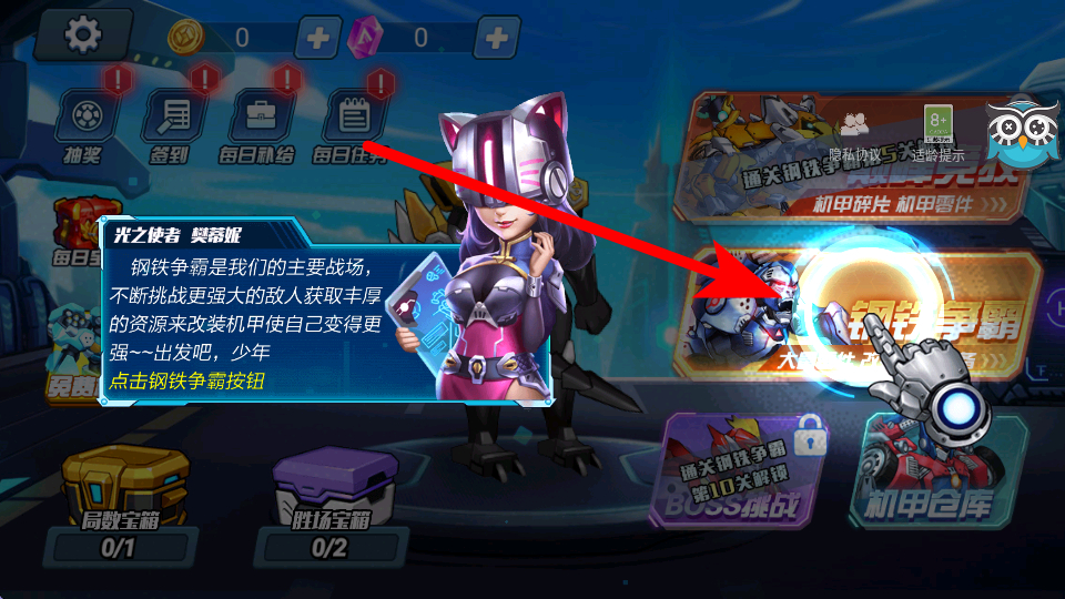 4、完成初步準備后,點擊鋼鐵爭霸按鈕,進入主要戰(zhàn)場,不斷挑戰(zhàn)更強大的敵人,獲取豐厚資源,用這些資源改裝機甲,讓自身變得更強。
