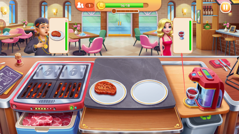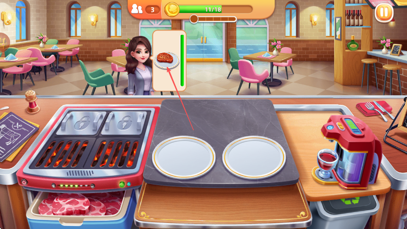 1、進(jìn)入游戲,留意餐廳內(nèi)顧客頭頂?shù)氖澄飯D標(biāo),了解他們的需求,比如牛排。