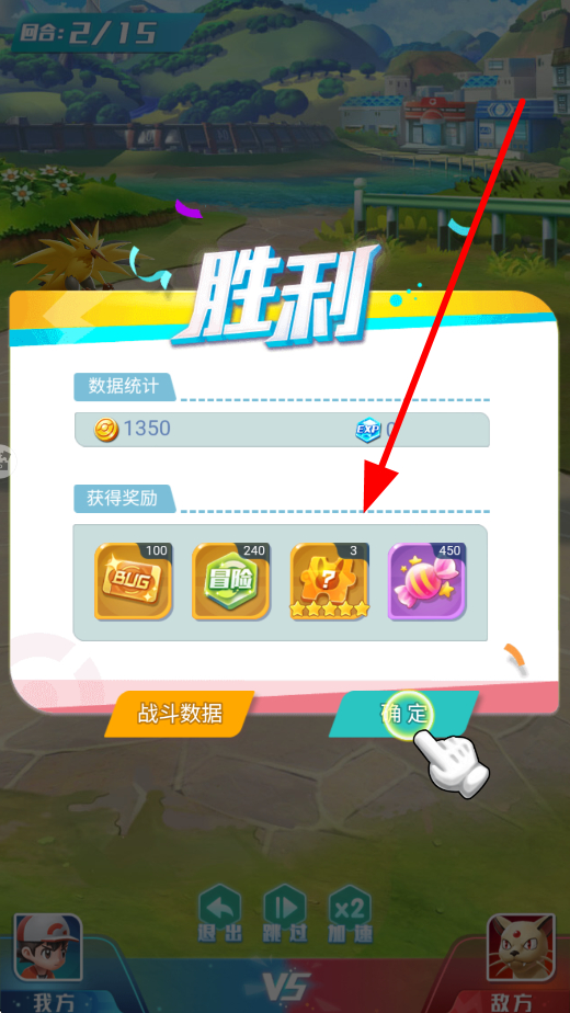 4、成功完成戰(zhàn)斗等操作后,顯示勝利,展示獲得的獎(jiǎng)勵(lì),包括金幣、各類道具等,點(diǎn)擊確定,即可領(lǐng)取獎(jiǎng)勵(lì),用于后續(xù)精靈培養(yǎng)等操作。