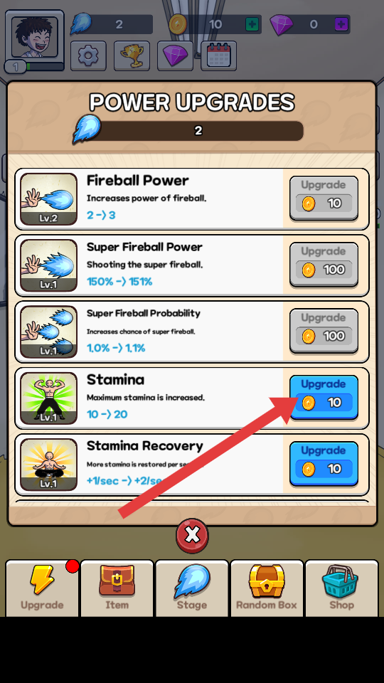 2、進(jìn)入POWER UPGRADES升級界面后,花費10金幣可將最大耐力從10提升至20,提升角色的持續(xù)的戰(zhàn)斗的能力。