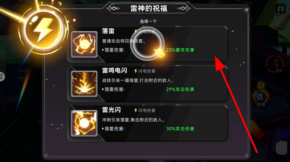 4、冒險過程中出現(xiàn)技能選擇,像雷神的祝福技能,根據(jù)戰(zhàn)斗需求與技能效果,選擇合適的技能,增強角色實力,更好地應(yīng)對后續(xù)冒險挑戰(zhàn)。