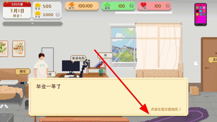 1、新人玩家開(kāi)始體驗(yàn),首先進(jìn)入游戲,會(huì)有畢業(yè)一年了的提示,點(diǎn)擊任意位置繼續(xù),開(kāi)啟在我獨(dú)自生活中的生活模擬之旅。