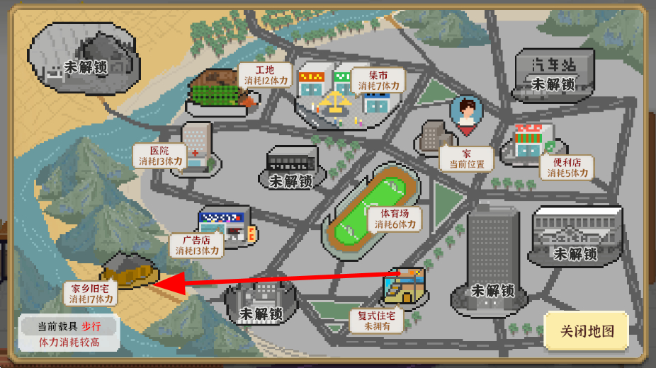 3、查看地圖,地圖上有工地、集市、醫(yī)院等不同場(chǎng)景,可選擇前往的地點(diǎn),在場(chǎng)景間移動(dòng),消耗相應(yīng)體力,去體驗(yàn)不同場(chǎng)景的生活內(nèi)容。