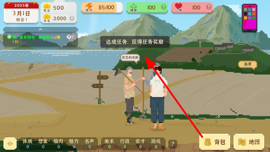 4、到達(dá)像家鄉(xiāng)舊宅這樣的場(chǎng)景后,會(huì)遇到任務(wù),完成任務(wù)后,能達(dá)成任務(wù)并獲得任務(wù)獎(jiǎng)勵(lì),借助獎(jiǎng)勵(lì)提升自身,更好地體驗(yàn)獨(dú)自生活。