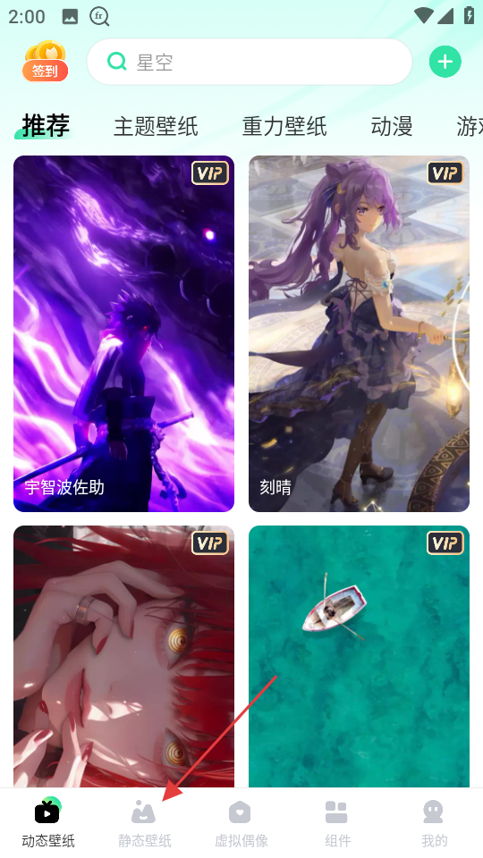 1、在動(dòng)態(tài)壁紙頁面,點(diǎn)擊底部的靜態(tài)壁紙,進(jìn)入靜態(tài)壁紙頁面。