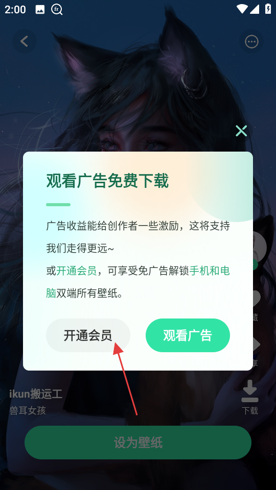 4、在彈窗中,可選擇開通會(huì)員免廣告解鎖該壁紙?jiān)O(shè)置。