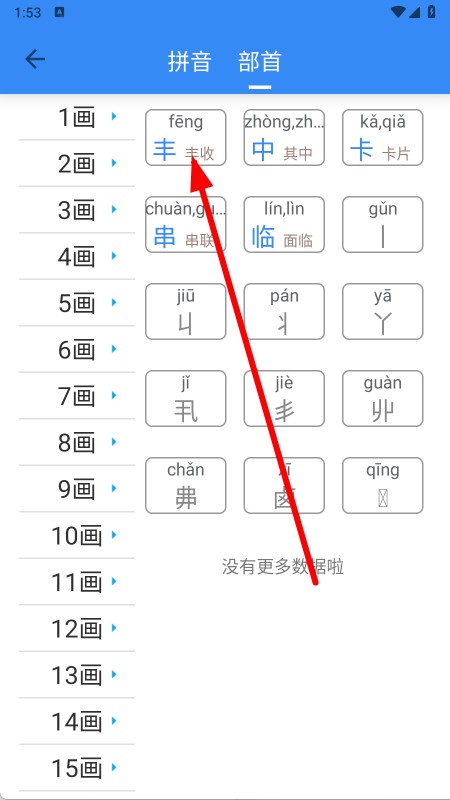 2、先選擇對應(yīng)筆畫數(shù),再點(diǎn)擊目標(biāo)部首漢字,進(jìn)入關(guān)聯(lián)漢字列表。