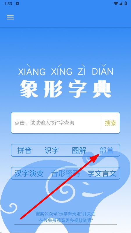 1、在首頁點(diǎn)擊部首選項(xiàng),進(jìn)入部首查詢頁面。