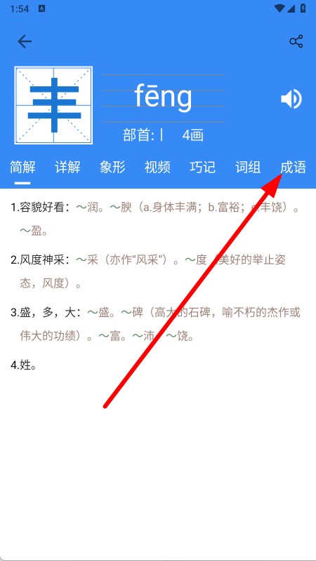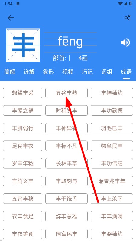 4、在漢字詳情頁面,點(diǎn)擊成語選項(xiàng),跳轉(zhuǎn)至與該漢字相關(guān)的成語列表。