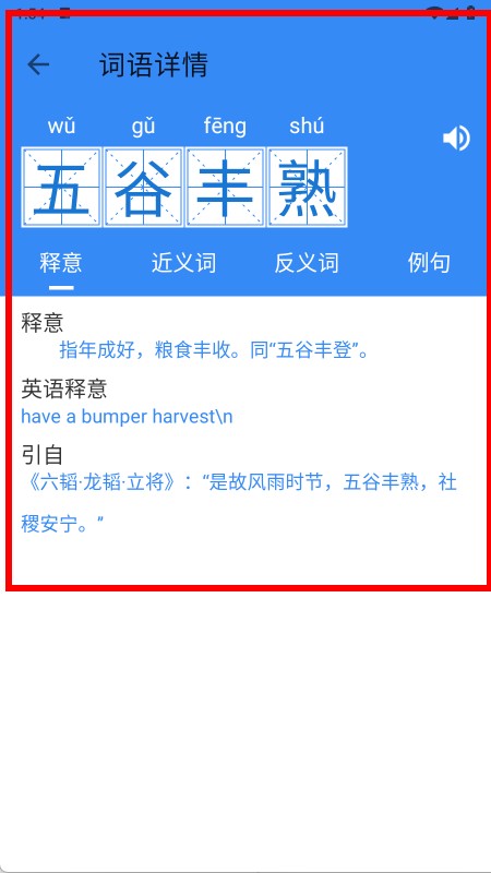 5、點(diǎn)擊目標(biāo)成語,進(jìn)入成語詳情頁,可查看釋意、近義詞、反義詞及例句,加深理解。