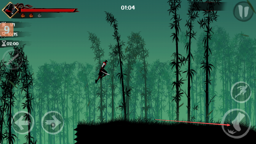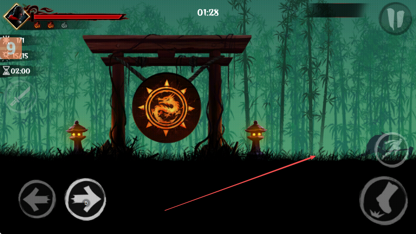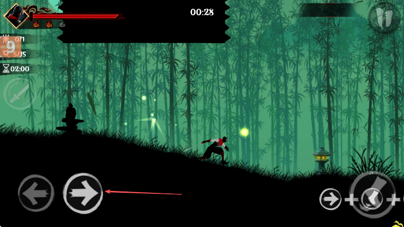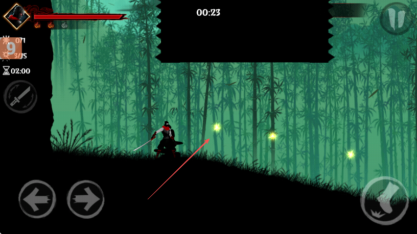 1、游戲開始,通過屏幕左下角的左右方向鍵操控忍者移動(dòng),探索竹林場景。