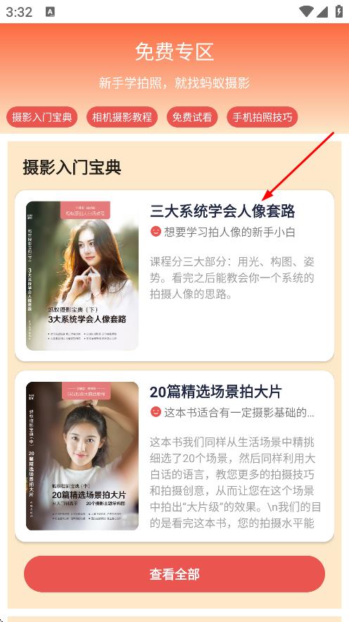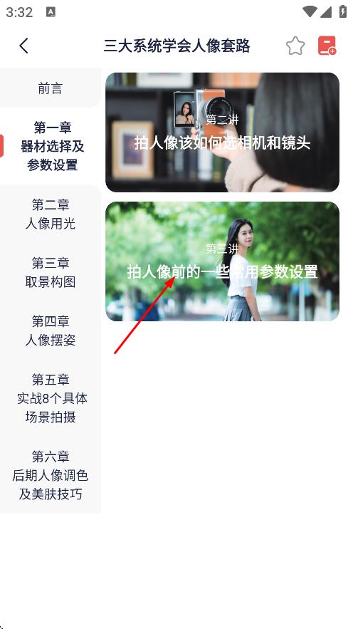 4、在章節(jié)學(xué)習(xí)頁面,可查看課程內(nèi)容,進(jìn)行攝影知識。