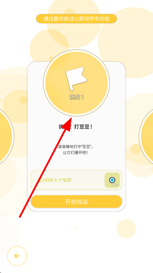 2、接著在挑戰(zhàn)界面,點(diǎn)擊開(kāi)始挑戰(zhàn),進(jìn)入挑戰(zhàn)場(chǎng)景,根據(jù)提示,精準(zhǔn)操作去擊中如豆豆等目標(biāo),讓目標(biāo)爆開(kāi),推進(jìn)挑戰(zhàn)進(jìn)程。