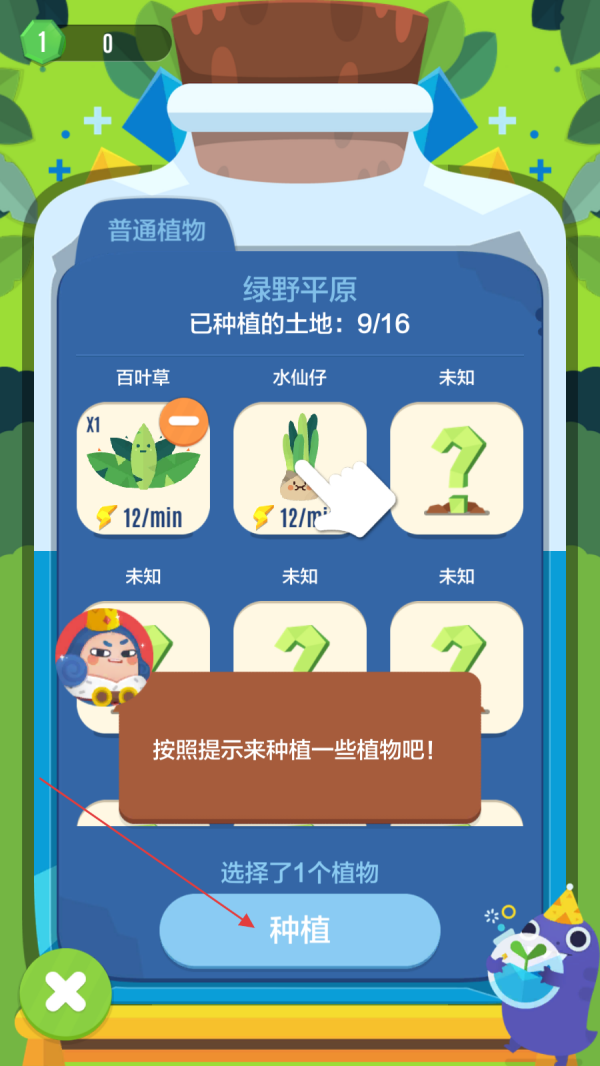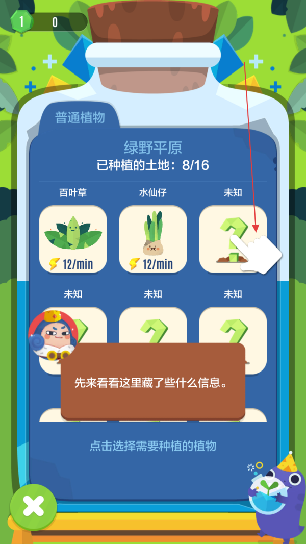 2、在彈出的“綠野平原”植物選擇界面,留意到有標著“未知”的植物選項,根據(jù)提示點擊該“未知”植物區(qū)域,查看這里隱藏的信息,為后續(xù)種植做準備。