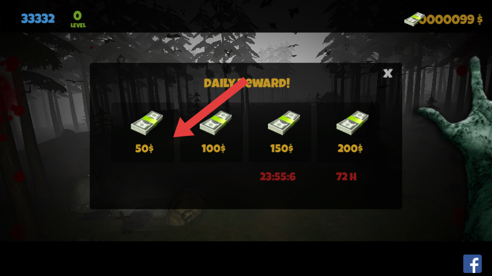 1、在僵尸射擊游戲中,領(lǐng)取每日獎(jiǎng)勵(lì)可獲得50美元,積累的金錢可用于購買武器或升級裝備,提升能力。