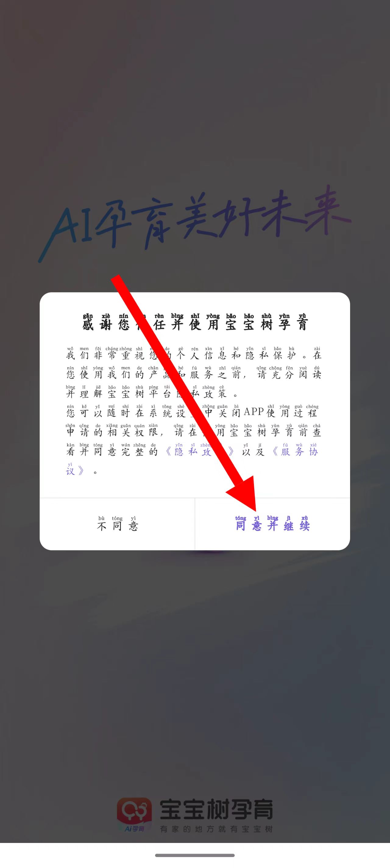 1、打開(kāi)寶寶樹(shù)孕育,點(diǎn)擊同意并繼續(xù)。