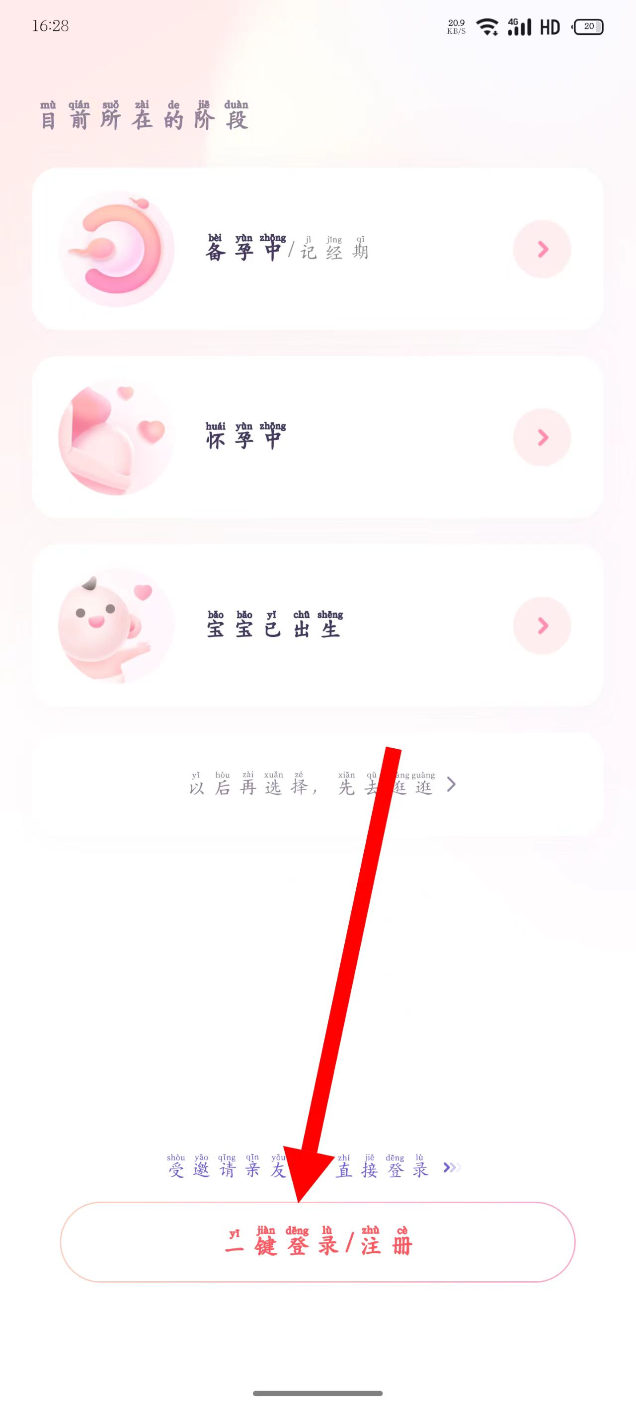 2、在頁(yè)面,點(diǎn)擊下方一鍵登錄注冊(cè)。