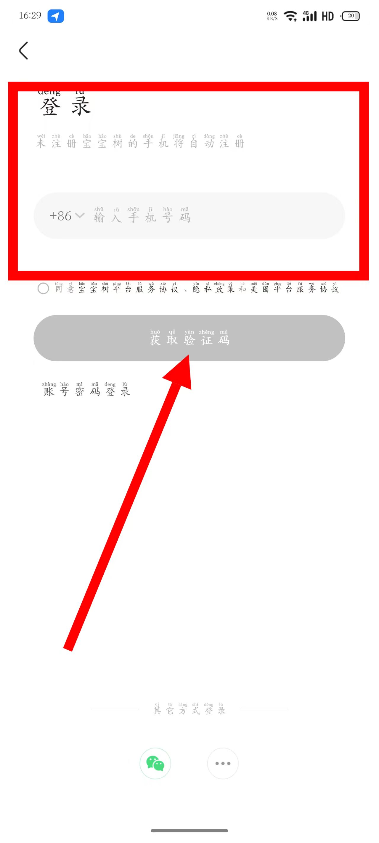 3、輸入手機(jī)號(hào)碼后,點(diǎn)擊獲取驗(yàn)證碼。