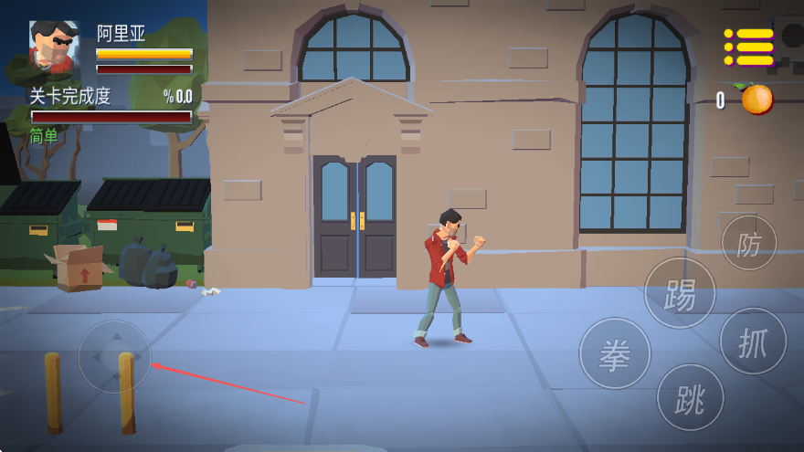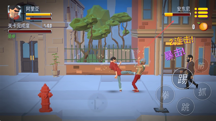 1、基礎(chǔ)格斗操作:通過(guò)虛擬搖桿控制角色在街頭移動(dòng),點(diǎn)擊攻擊鍵釋放拳頭攻擊,遇到多個(gè)敵人時(shí)點(diǎn)擊閃避鍵躲避?chē)ィ苊庀萑氡粍?dòng)挨打局面。
