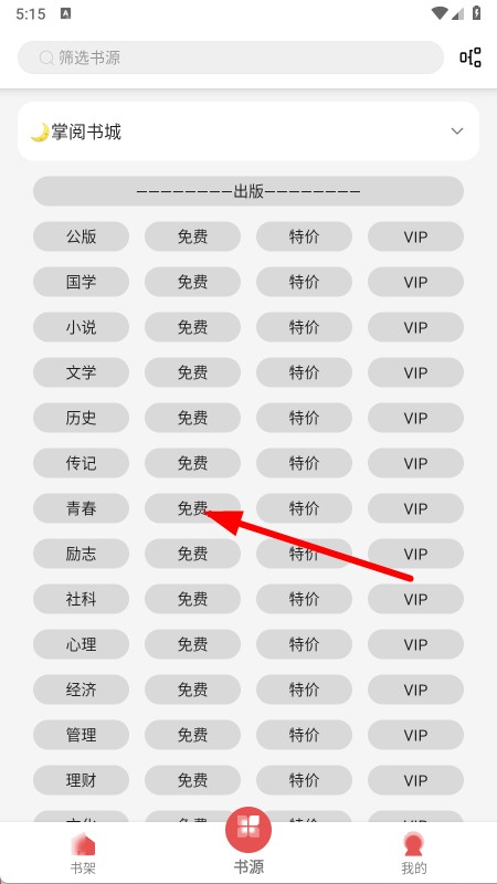 2、在書源頁面,找到青春分類下的免費(fèi)選項(xiàng)并點(diǎn)擊。