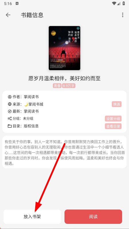 4、進(jìn)入書籍信息頁面后,點(diǎn)擊放入書架,即可將小說加入書架以便后續(xù)閱讀。