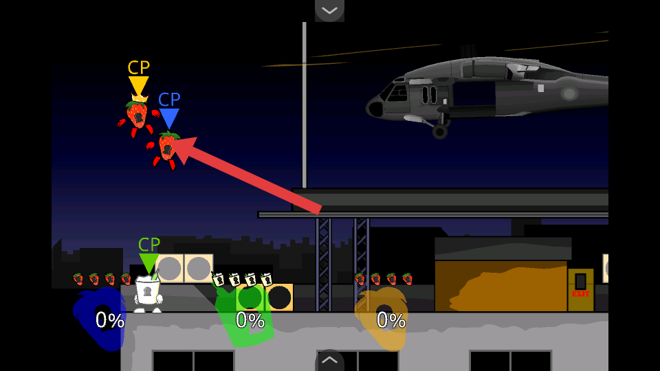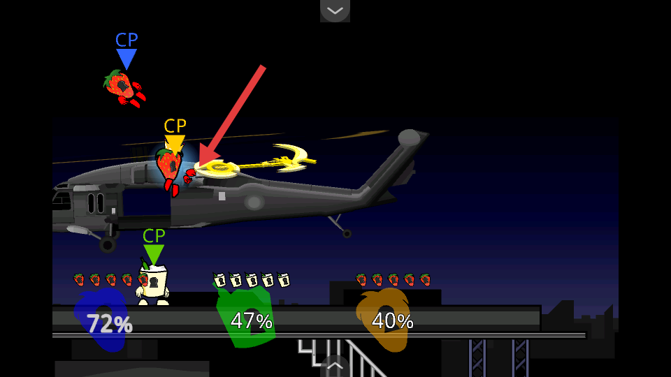 2、多個草莓角色協(xié)同作戰(zhàn),在城市夜景的場景中追擊直升機(jī),通過團(tuán)隊配合可更高效地完成攻擊任務(wù)。
