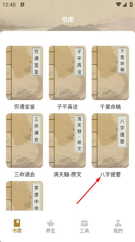1、在書庫頁面,點(diǎn)擊八字提要書籍,進(jìn)入書籍詳情頁面。