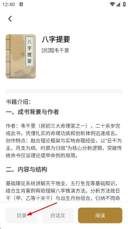 2、在書籍詳情頁面,點(diǎn)擊目錄,進(jìn)入目錄頁面。