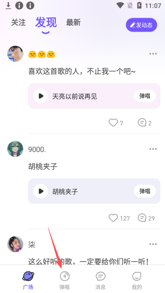3、廣場互動分享:進(jìn)入“廣場”板塊,點(diǎn)擊發(fā)布按鈕上傳已保存的彈唱作品,可添加作品描述與話題標(biāo)簽,同時可瀏覽他人作品,進(jìn)行點(diǎn)贊等互動操作。