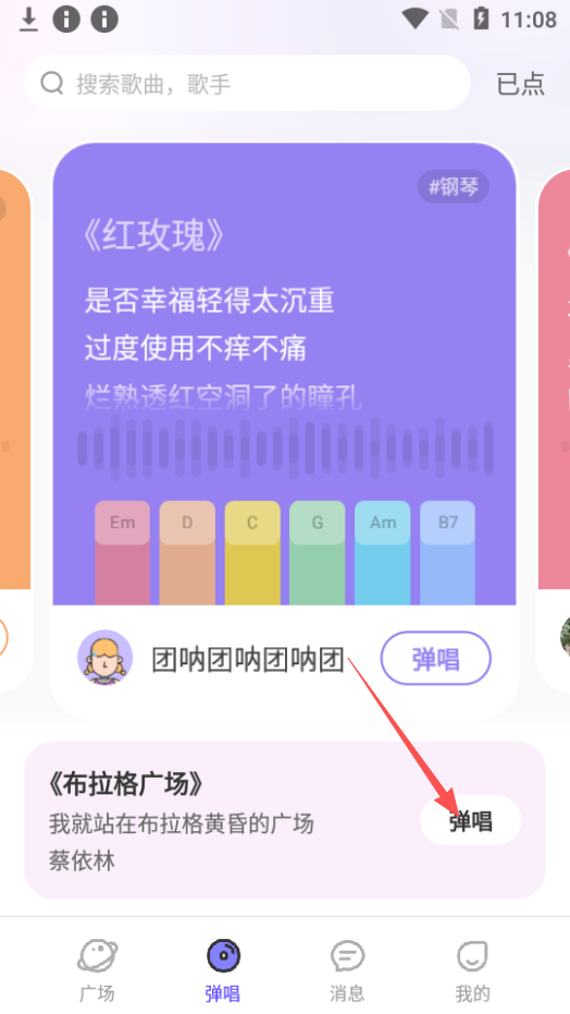 1、打開彈唱達(dá)人,在廣場頁面,點(diǎn)擊底部的彈唱,進(jìn)入彈唱頁面。