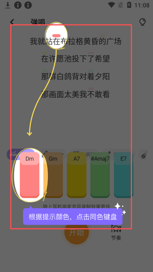 3、在歌曲彈唱準(zhǔn)備頁面,根據(jù)提示,按照顏色點(diǎn)擊同色鍵盤,熟悉彈唱操作。