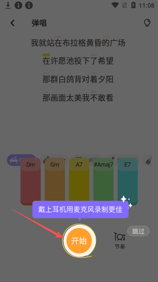 4、準(zhǔn)備好后,點(diǎn)擊開始,即可進(jìn)行歌曲彈唱,戴上耳機(jī)用麥克風(fēng)錄制效果更佳。