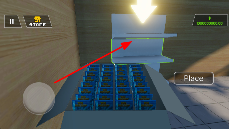 3、進(jìn)入商店內(nèi)部,找到空的貨架區(qū)域,點(diǎn)擊貨架,再點(diǎn)擊Place按鈕,就能把之前拾取的卡牌整齊擺放在貨架上,方便顧客選購(gòu)。