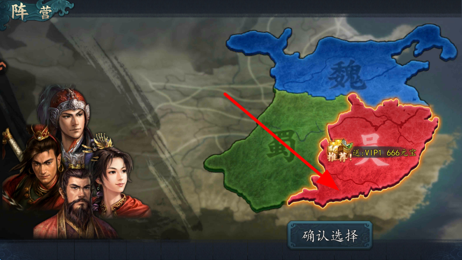 2、接著進(jìn)行陣營(yíng)選擇,可在魏、蜀、吳三大陣營(yíng)中挑選,不同陣營(yíng)有不同特點(diǎn)與福利,選好后點(diǎn)擊確認(rèn)選擇,加入對(duì)應(yīng)陣營(yíng)。