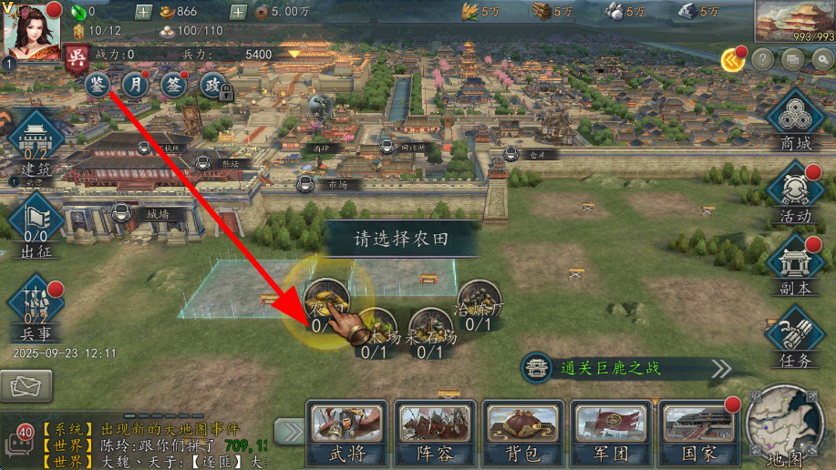 3、進(jìn)入主界面后,要發(fā)展資源,比如點(diǎn)擊農(nóng)田,可進(jìn)行資源生產(chǎn),獲取糧食等資源,為城池建設(shè)、軍隊(duì)的發(fā)展提供后勤保障。