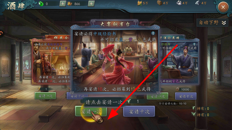 4、酒肆招募武將,在酒肆中,可選擇宴請(qǐng)一次或宴請(qǐng)十次,通過(guò)宴請(qǐng)有機(jī)會(huì)招募到藍(lán)、紫、橙色等不同品質(zhì)的武將,增強(qiáng)自身勢(shì)力。