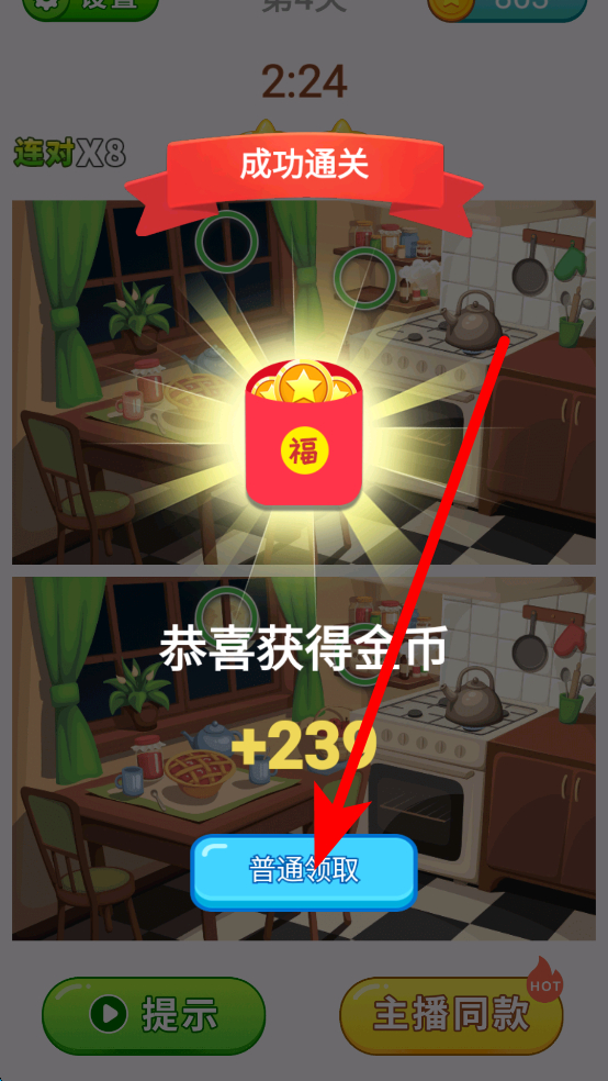 4、通關(guān)后,會獲得金幣獎勵,可點(diǎn)擊領(lǐng)取按鈕獲取這些金幣,金幣能用于游戲內(nèi)的一些功能或道具解鎖等。