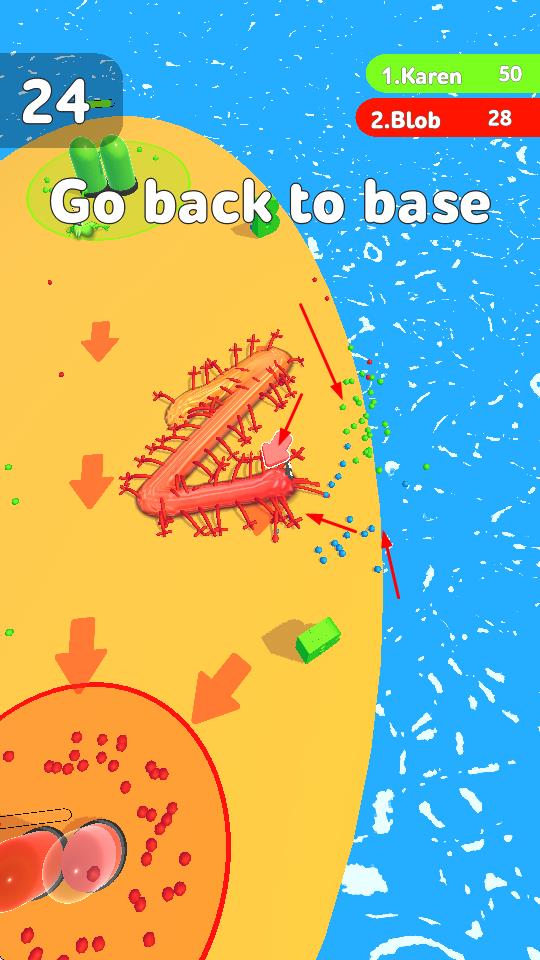 2、收集成長(zhǎng)循環(huán)清晰:賽道中散落著字母與顆粒,玩家操控史萊姆收集后身體會(huì)直觀變長(zhǎng),這種成長(zhǎng)變化極具成就感,返回陣地即可觸發(fā)升級(jí),形成收集變長(zhǎng)返程升級(jí)的完整閉環(huán)。