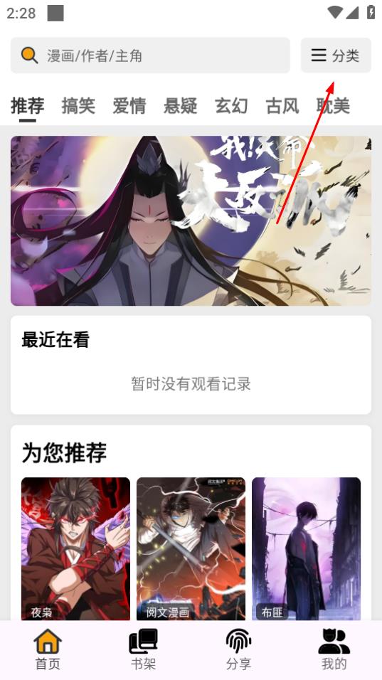 1、打開輕漫島,點(diǎn)擊頁面右上角的分類,進(jìn)入漫畫分類頁面。