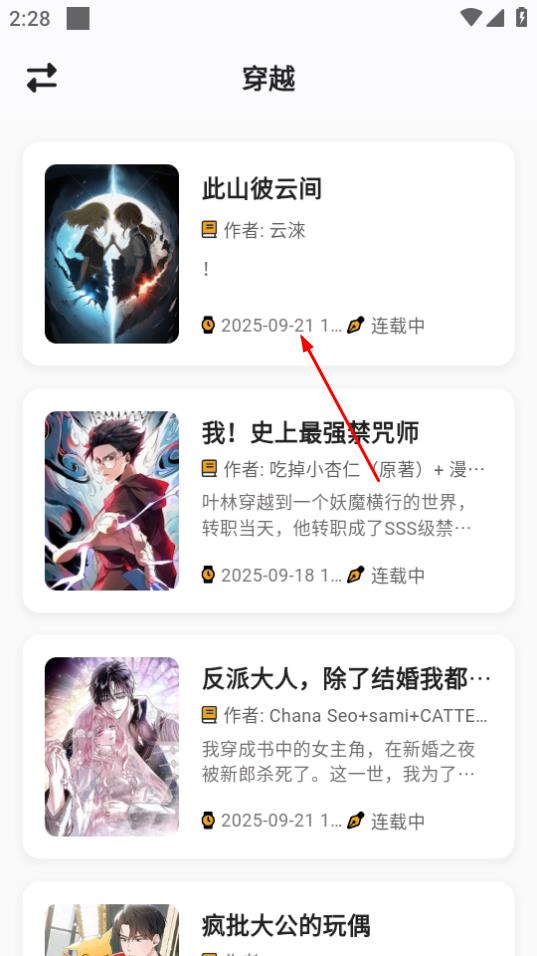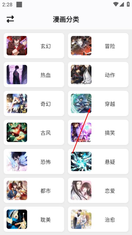 2、在漫畫分類頁面,點(diǎn)擊穿越分類,查看穿越類漫畫。