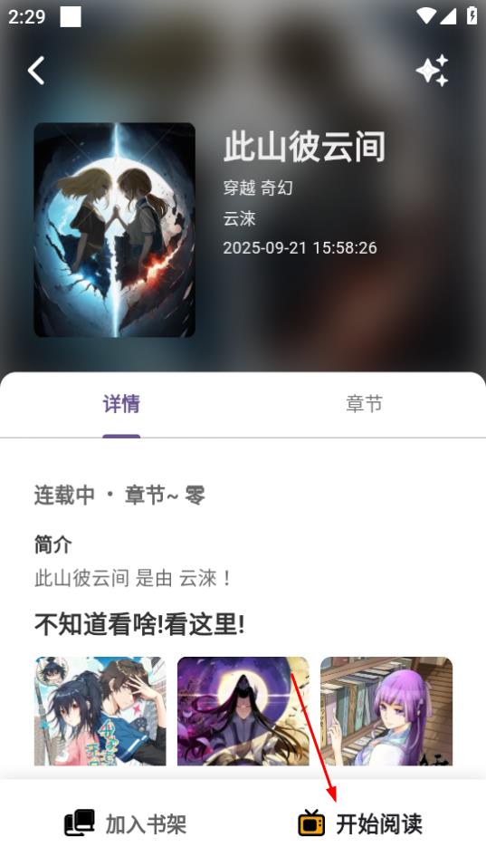 4、在此山彼云間詳情頁,點(diǎn)擊開始閱讀,即可閱讀漫畫。