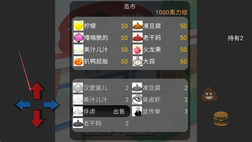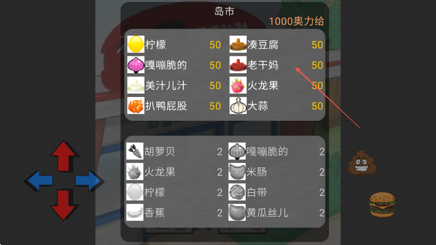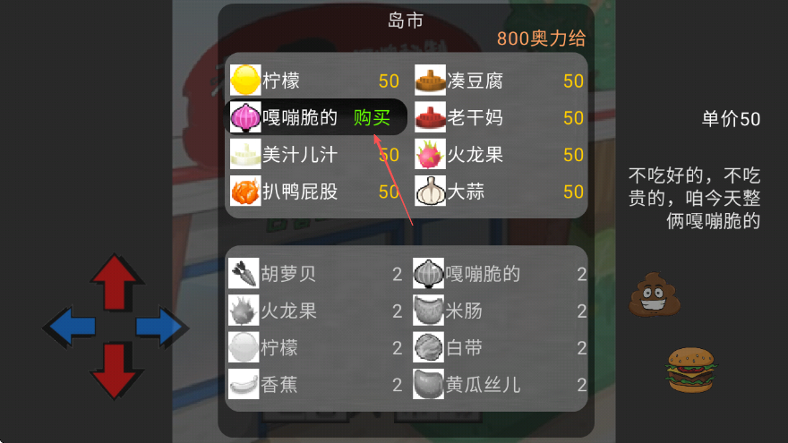 1、進(jìn)入游戲,通過屏幕左側(cè)方向鍵切換查看不同食材及其價(jià)格,如老干媽50奧力給。