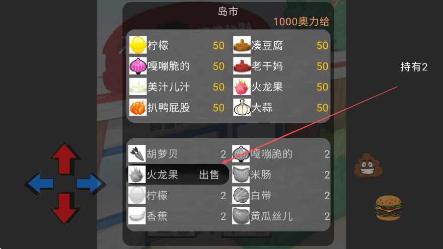 2、找到想要出售的食材,比如火龍果,點(diǎn)擊進(jìn)行出售操作獲取奧力給貨幣。