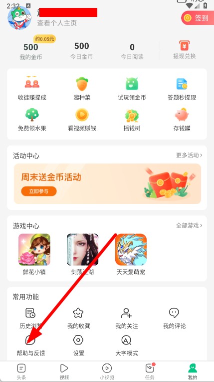2、在我的頁面,點擊左下方幫助與反饋。