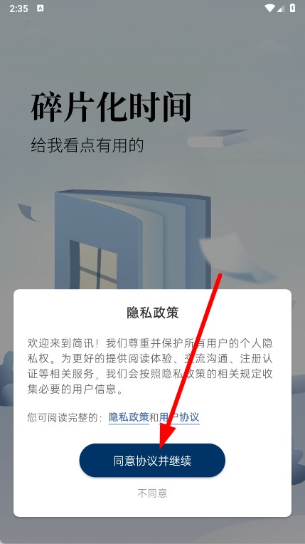 1、打開(kāi)簡(jiǎn)訊,在彈窗中點(diǎn)擊同意協(xié)議并繼續(xù)。