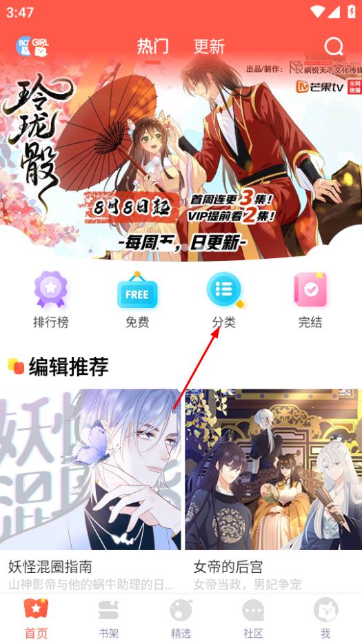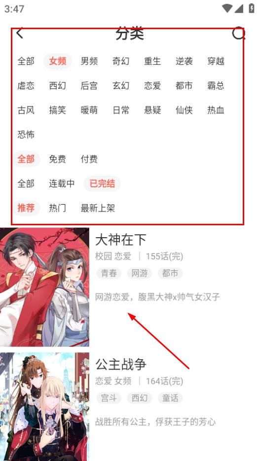 2、在分類頁(yè)面,篩選好條件后,點(diǎn)擊大神在下,進(jìn)入該漫畫(huà)詳情頁(yè)。