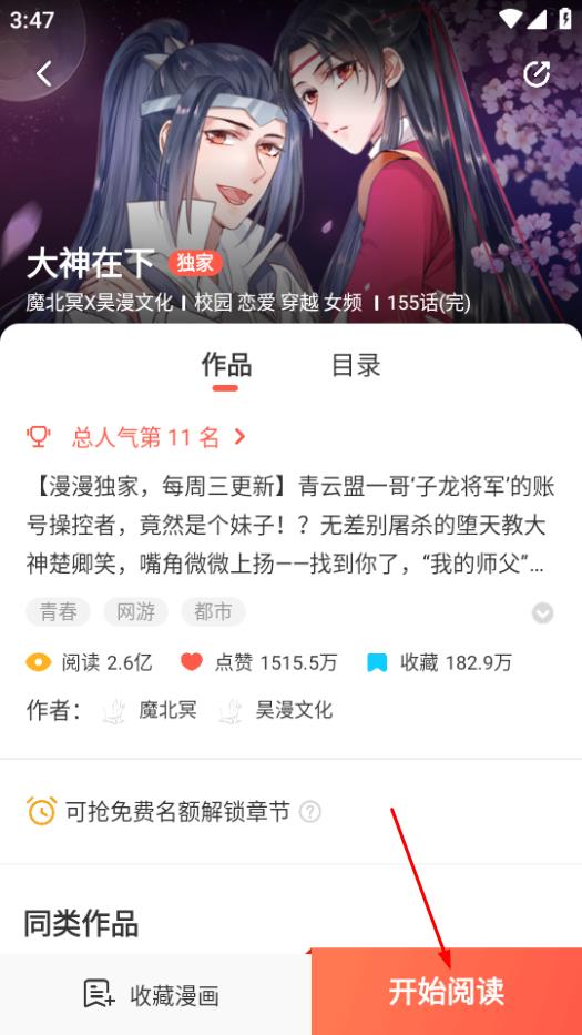 3、在大神在下詳情頁(yè),點(diǎn)擊開(kāi)始閱讀,進(jìn)入閱讀界面。
