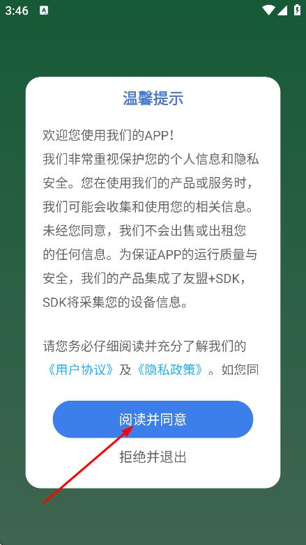 1、在溫馨提示彈窗中,點(diǎn)擊閱讀并同意,進(jìn)入首頁(yè)。